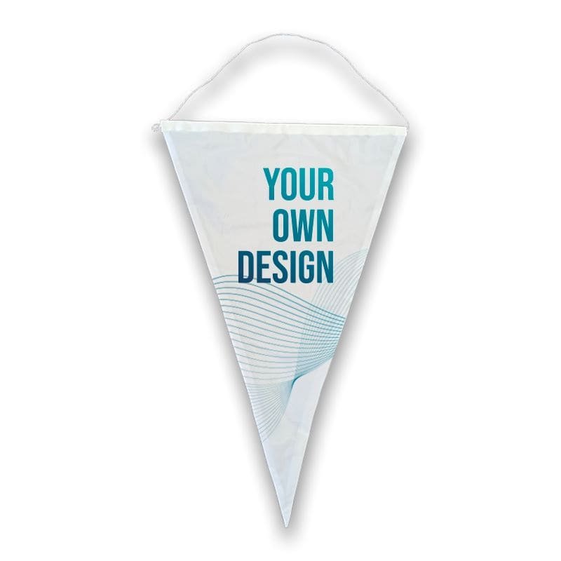 Elaborada en tela 100% poliéster de 115g/m², cuenta con cuerda en la parte superior para colgar, con vaina superior abierta acompañada de un palo de madera, y con vaina inferior cerrada para palo de plástico.